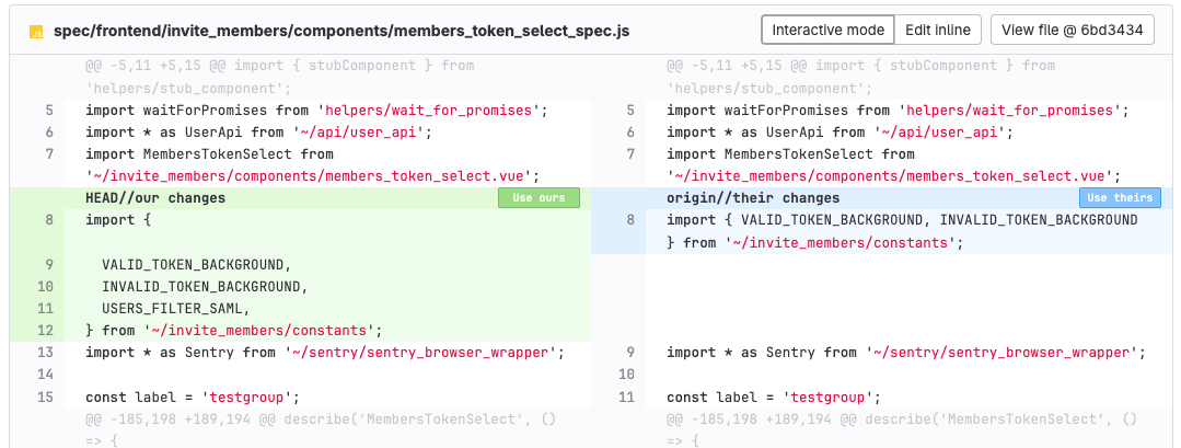 - Interactive mode: UI method best for conflicts that only require you to select which version of a line to keep, without edits.